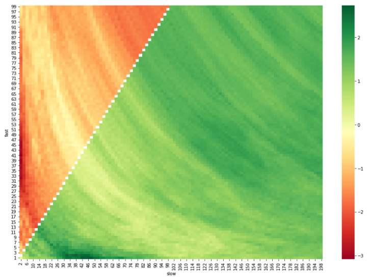 Figure 1 clearly shows an underperformance with the initial half-life parameters. To gain a general understanding of performance, we iterate across a wide range of half-life parameters for fast and slow exponential moving averages - to generate a sharpe field. A green label indicates positive sharpe, while a red label indicates negative sharpe. We can then visually identify regions in the parameter space indicating a positive sharpe.
